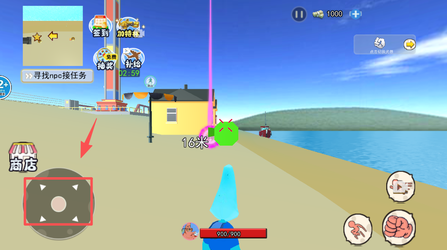 2、使用虚拟摇杆控制角色移动,探索商店和其他区域,寻找任务和资源。