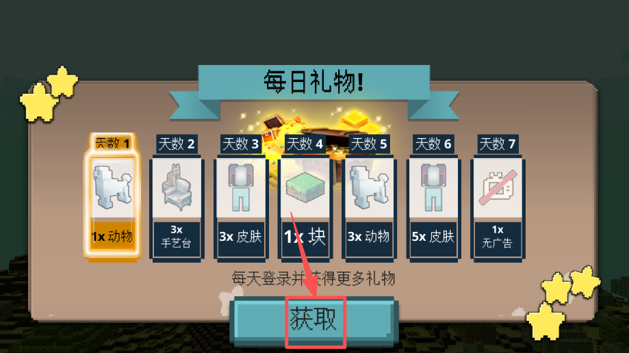 4、在每日礼物界面,点击 “获取” 按钮,领取当天对应的登录奖励道具。