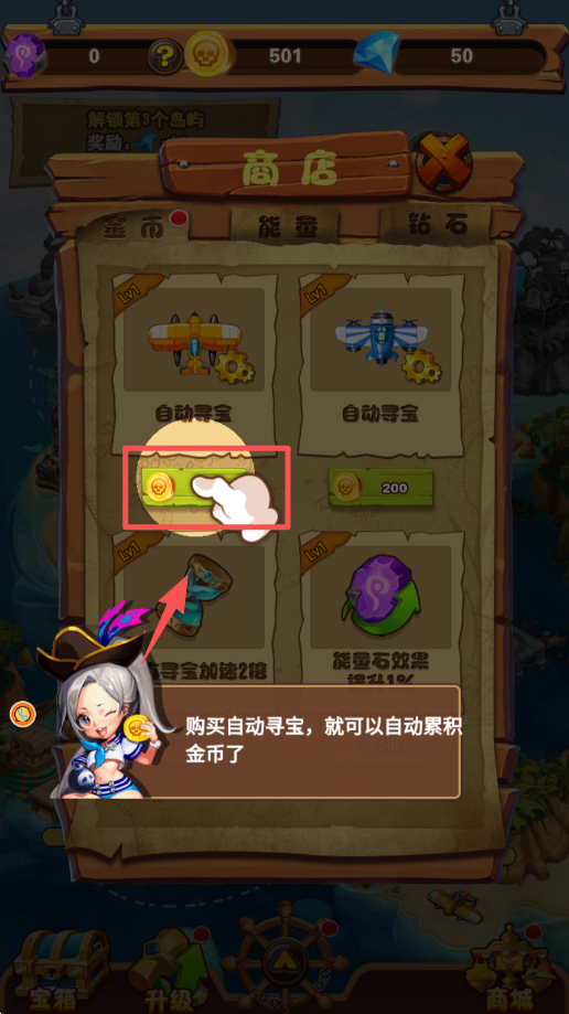 4、购买自动寻宝道具,自动累积金币,轻松进行游戏。