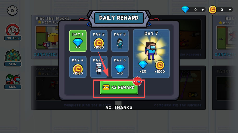 1、查看每日奖励,点击“X2 REWARD”按钮,领取双倍奖励,快速积累资源。