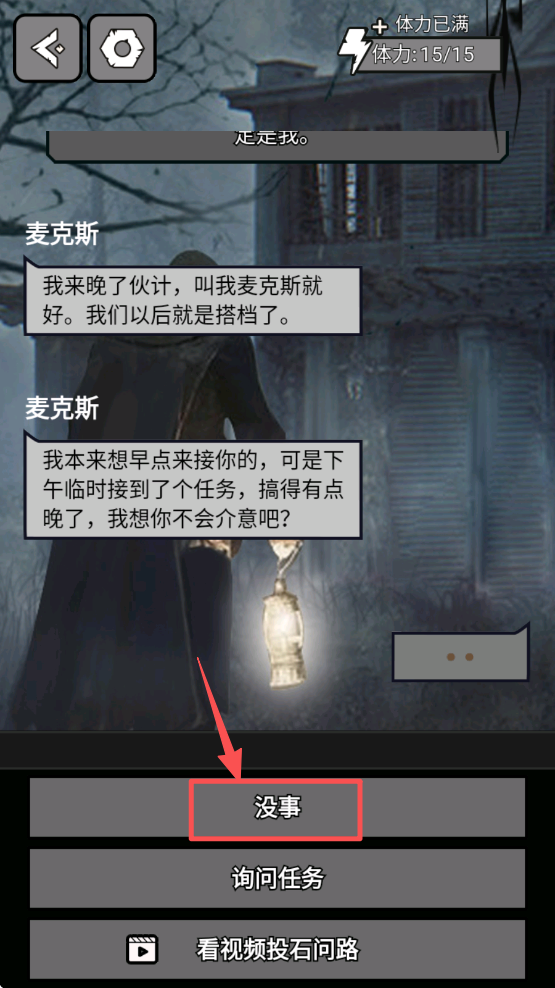4、在对话选择中,点击“没事”按钮,继续与角色互动,推动故事发展。