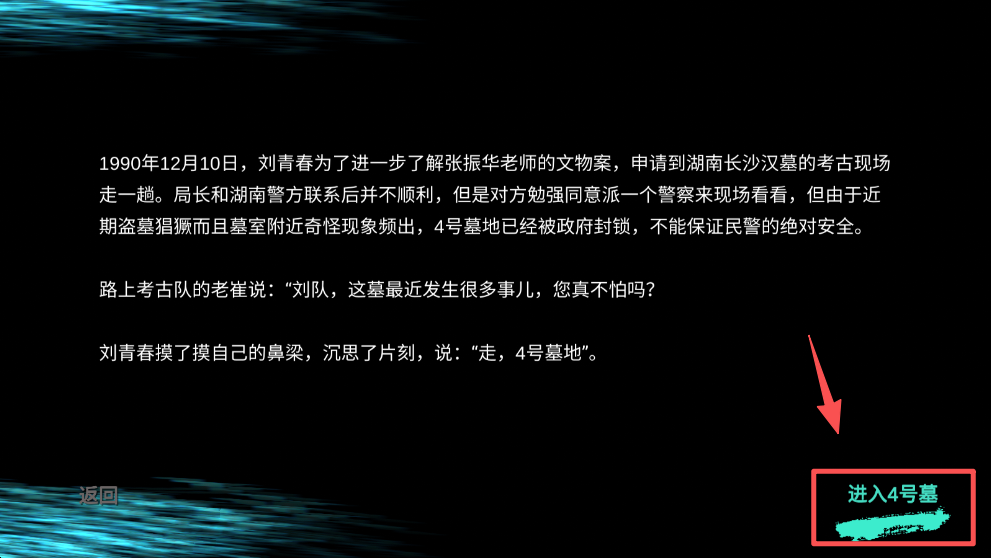 2、接着,阅读游戏背景故事,了解案件的基本情况,然后点击“进入4号墓”按钮,深入探索。