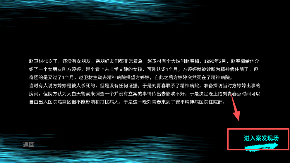 2、阅读完剧情文本后,点击 “进入案发现场” 按钮,进入游戏的操作引导界面。