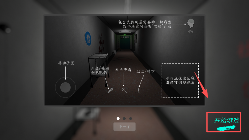 3、在操作引导页面确认提示后,点击 “开始游戏” 按钮,正式进入案发现场场景。