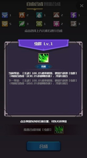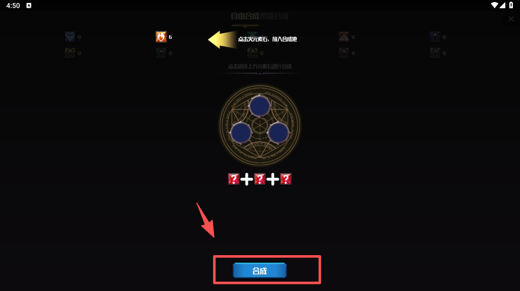 3、在合成界面,点击 “合成” 按钮,将元素石组合成技能,为战斗做准备。