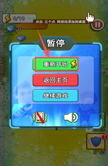 4、若关卡挑战不顺利,点击 “重新开始” 按钮重试当前关卡。