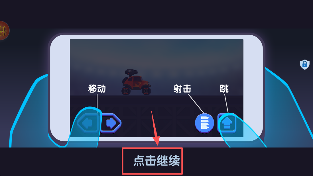 2、点击 “点击继续” 跳过操作提示,进入战车对战场景。