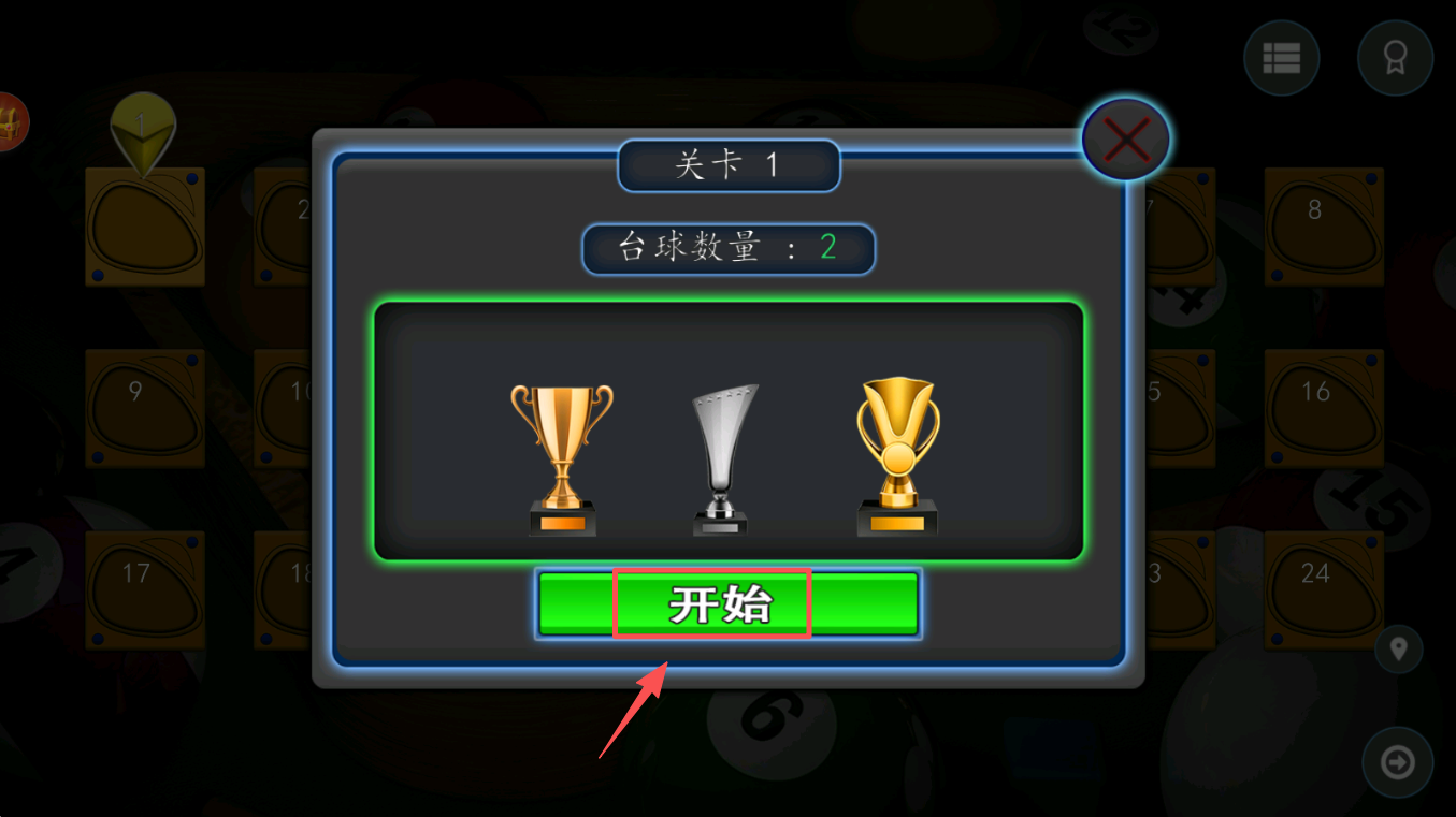 3、点击 “开始” 按钮,进入关卡 1,准备开始 2 颗球的台球对局。