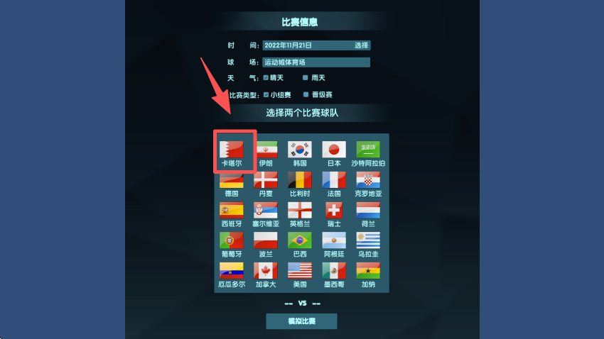 1、在游戏启动界面,点击 “开始模拟” 按钮,即可进入比赛信息设置页面。