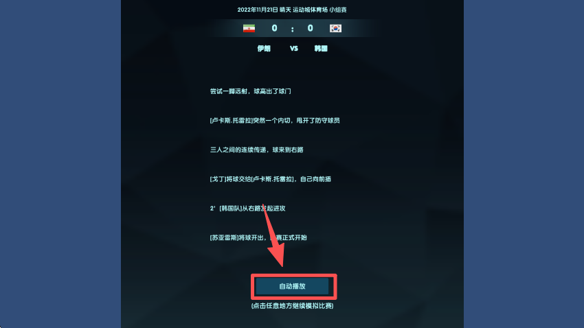 4、进入比赛界面后,点击 “自动播放” 按钮,就能观看这场足球比赛的模拟过程。