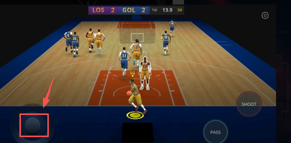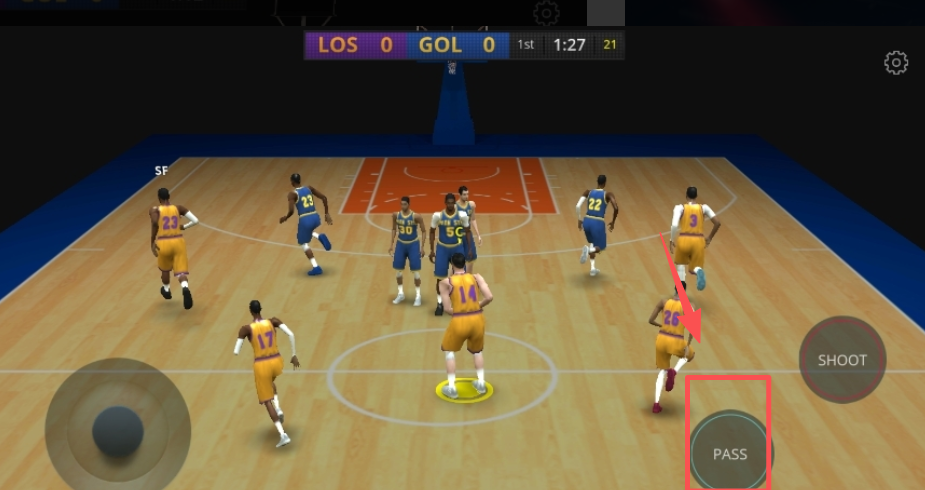 4、持球时,点击右侧 “PASS” 按钮,将球传给空位队友,配合组织进攻。