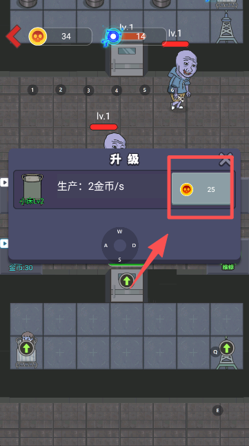 2、打开升级界面,点击 25 金币的按钮,升级金币生产建筑来提升收益。