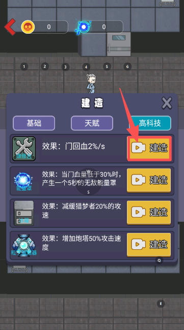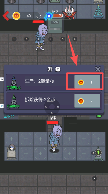 3、在升级界面选能量生产建筑,点击 8 金币按钮完成该建筑的升级操作。