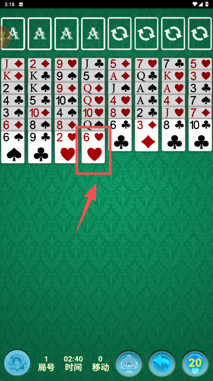 1、在该纸牌游戏的牌局界面中,点击红框标注的 6♥纸牌,完成这一步操作来推进当前牌局。