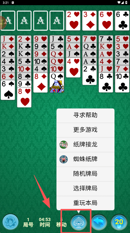 3、点击游戏界面底部的纸牌样式按钮,打开包含 “重玩本局” 等选项的功能菜单。