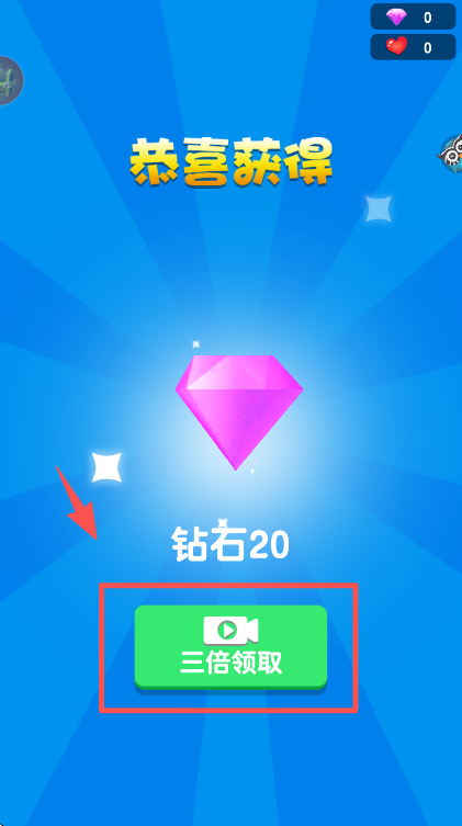 1、在奖励界面点击 “三倍领取” 按钮,通过观看视频的方式获取 3 倍数量的钻石奖励。