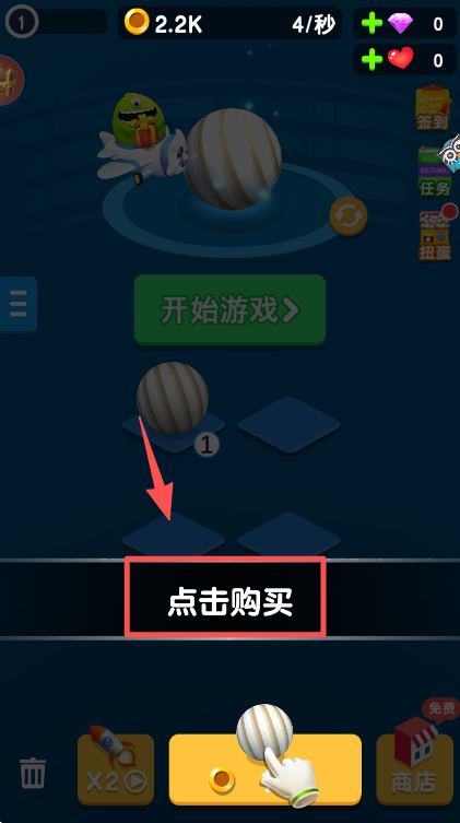 2、在游戏准备界面点击 “点击购买”,消耗资源解锁新的球球,拓展游戏的可玩内容。