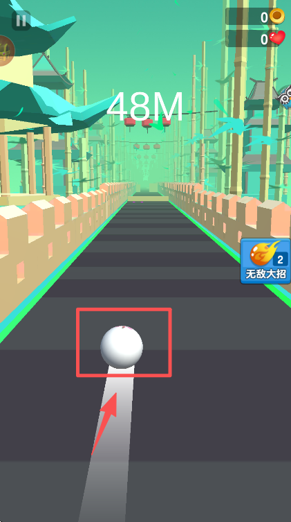 4、在对局中操控红框内的球球沿赛道移动,利用 “无敌大招” 等技能推进游戏进程。