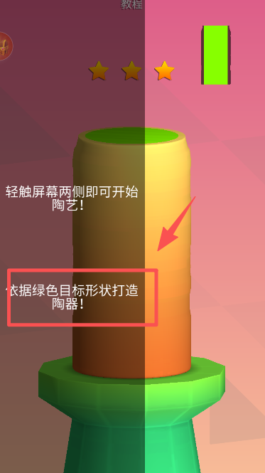 3、依据界面上方的绿色目标形状,调整陶艺的造型,完成对应的塑造要求。