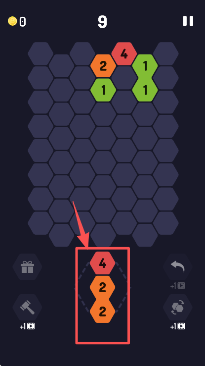 4、观察待放置的数字组合,如 4、2、2,将其拖到棋盘对应位置进行合成。