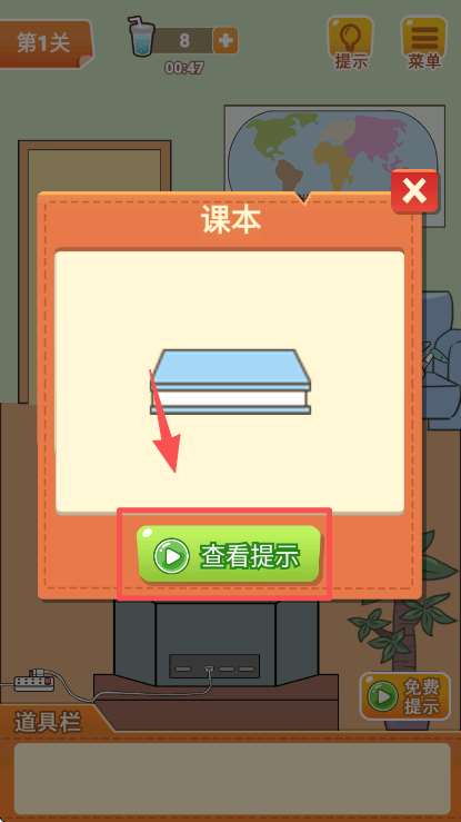 4、把道具栏里的课本放到电视上,完成这一步操作来达成关卡目标。