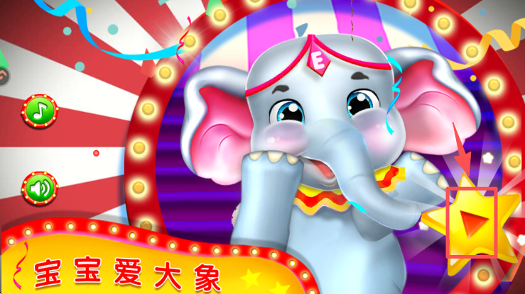 1、点击界面右侧带箭头的黄色星星按钮,进入 “宝宝爱大象” 的游戏后续界面。