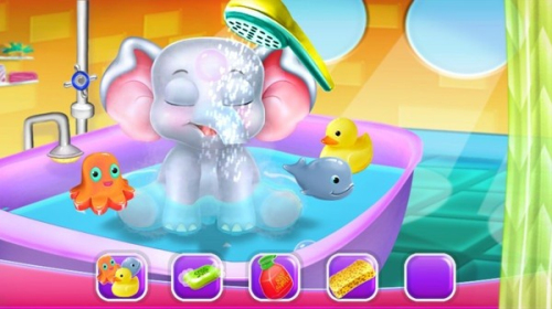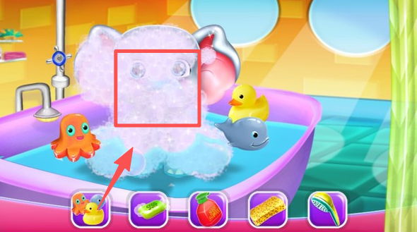 4、点击下方道具栏中的小黄鸭道具,将其放到洗澡盆,与洗澡的小象进行互动。