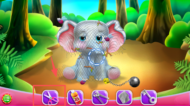3、点击界面下方道具栏内的剪刀道具,利用它剪开困住小象的网以解救小象。