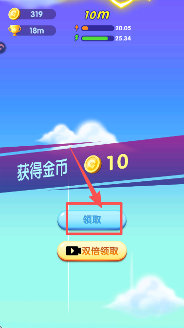 2、在结算界面点击 “领取” 按钮,获取本次游戏得到的 10 个金币。