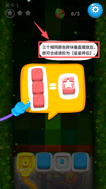 4、按照提示,将三个相同颜色砖块垂直摆放,合成星星砖石。