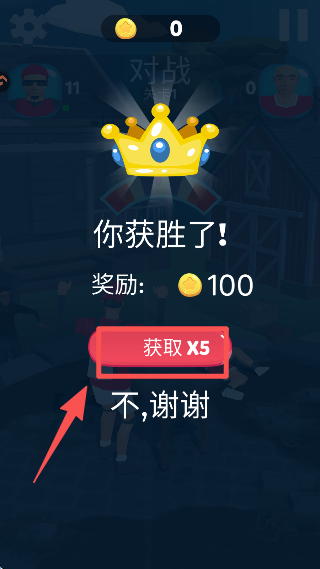4、对战获胜后,点击 “不,谢谢” 领取 100 金币的奖励。