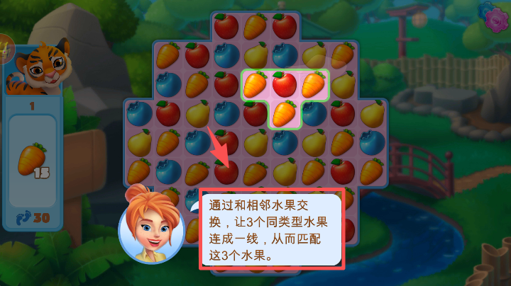 3、通过交换相邻水果的位置,让 3 个相同水果连成一线,完成匹配来推进关卡。