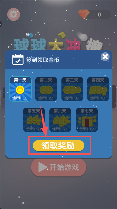 1、在签到弹窗中,点击 “领取奖励” 按钮,获取第一天对应的签到金币后关闭该弹窗。