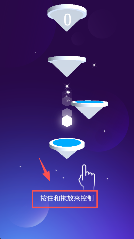 1、在游戏初始界面,按照提示按住并拖放操作,控制六边形物体在锥形平台间移动。