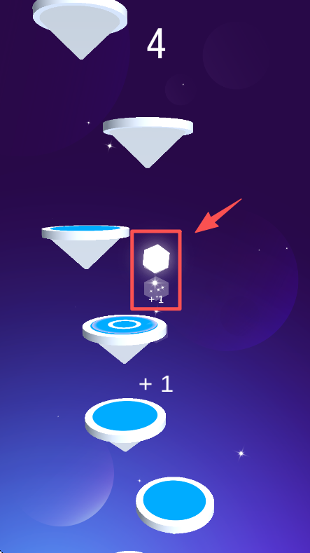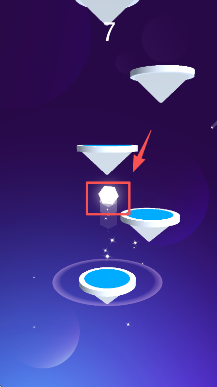 2、操控六边形物体落到带蓝色区域的平台上,收集该平台旁的道具,获取积分加成。