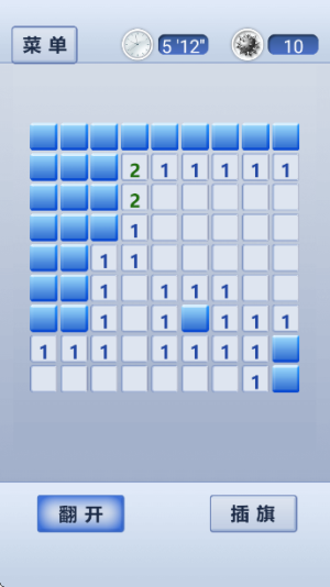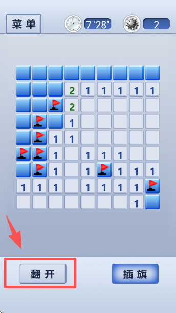 2、完成雷区标记后,点击下方的 “翻开” 按钮,切换到翻开状态,可点击方块查看其是否有雷。