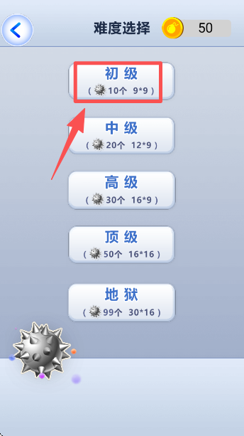 4、在难度选择界面,点击 “初级” 选项,就能选择含 10 个雷的初级难度来开启对应的排雷关卡。