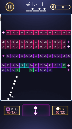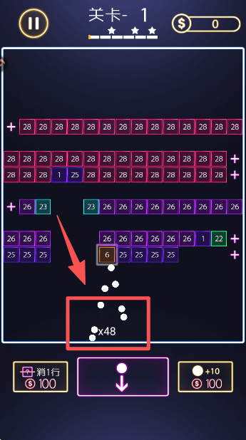 1、在关卡 1 中,点击下方标注 “×48” 的弹珠区域,瞄准上方数字区域发射弹珠进行消除。