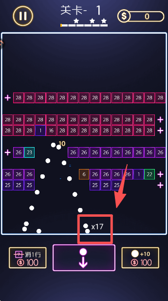 2、继续操作,点击下方 “×17” 的弹珠区域,发射弹珠匹配对应数字,推进关卡进度。
