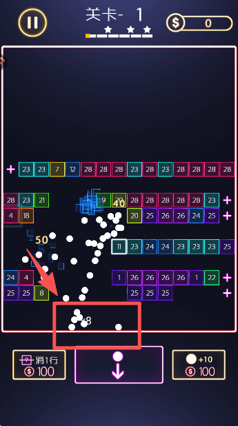 3、点击下方 “×8” 的弹珠区域,发射弹珠与上方数字方块互动,完成本轮弹珠投放。