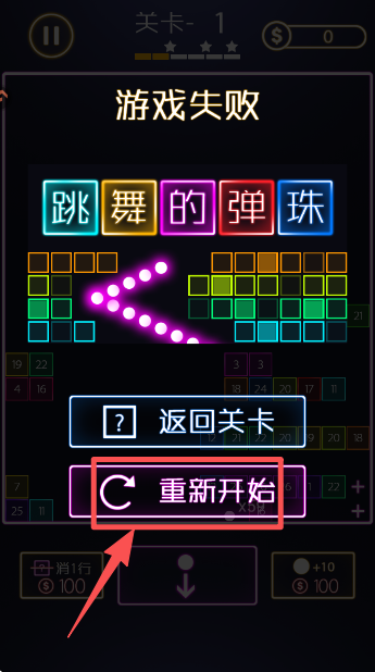 4、若游戏失败,在失败界面点击 “重新开始” 按钮,重新进入关卡 1 继续游玩。