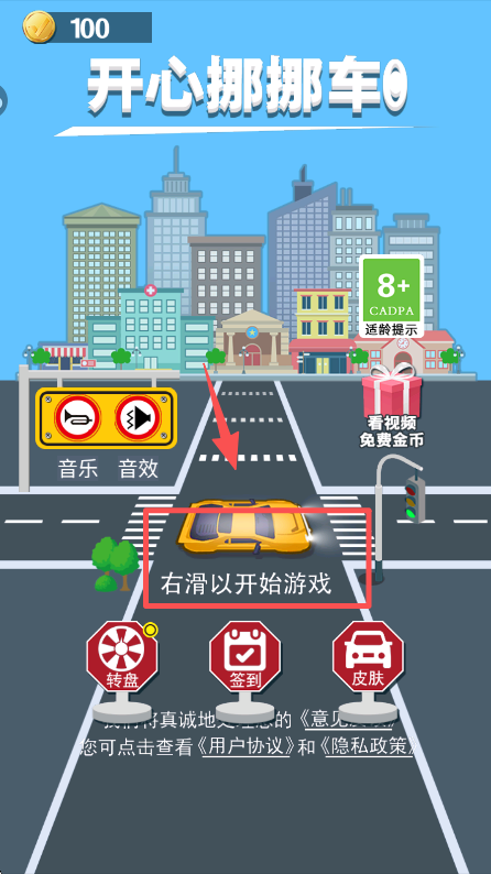 1、在 “开心娜娜车” 主界面,按照提示右滑黄色车辆,触发游戏启动进入关卡 1。