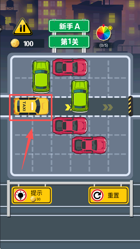 2、进入新手 A 第 1 关后,拖动黄色车辆,按道路箭头移动,避开其他车辆规划行驶路线。