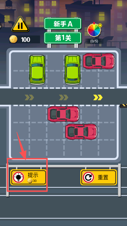 3、若行驶遇阻,点击左下角 “提示” 按钮,消耗 30 金币,获取车辆移动的线索。
