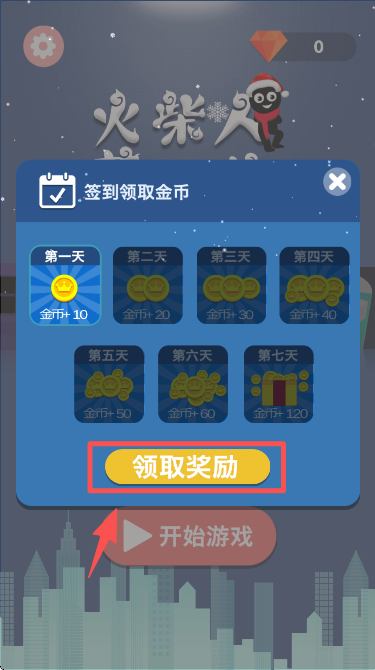 1、在游戏的签到界面,点击 “领取奖励” 按钮,获取第一天对应的金币奖励,为游戏做准备。