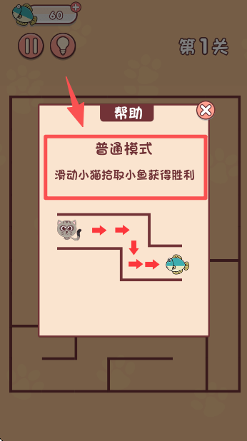 4、查看普通模式的帮助提示,了解通过滑动小猫拾取小鱼来获胜的规则。
