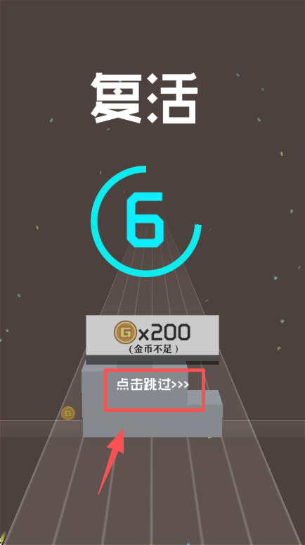 4、若游戏失败出现复活界面,点击 “点击跳过” 按钮,结束本次游玩返回界面。