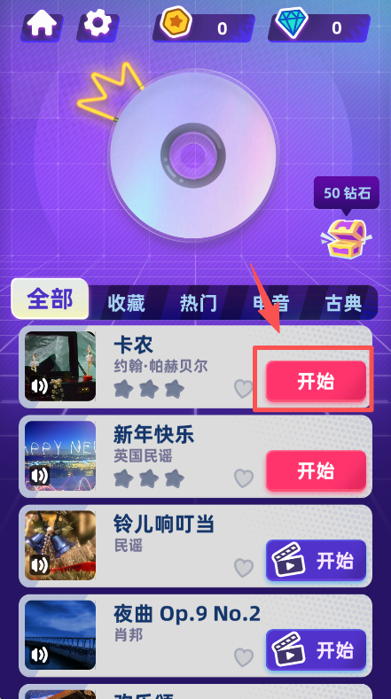 2、在曲目列表里选想要玩的音乐,点击对应的 “开始” 按钮进入该局游戏。