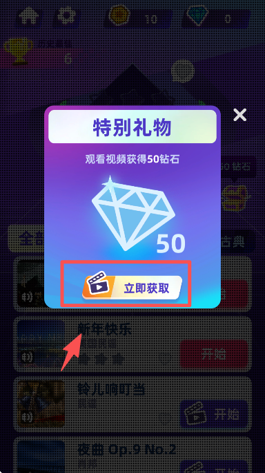 1、弹出 “特别礼物” 窗口时,点击 “立即获取” 按钮,观看视频就能获得 50 钻石奖励。