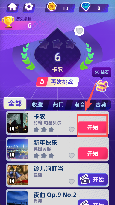 3、完成曲目挑战后,回到列表点击对应曲目的 “开始” 按钮,可再次挑战提升成绩。